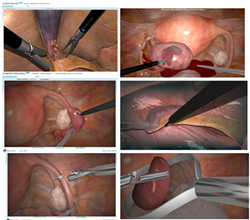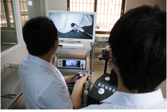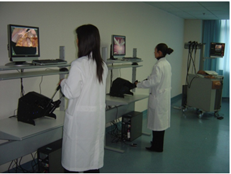 图1:教师指导学生进行模拟腔镜训练  图2:学生进行虚拟腔镜训练  图3:虚拟腔镜模拟手术整体效果图