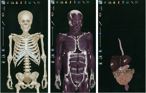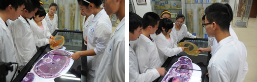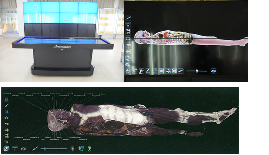 图 2多点触控虚拟解剖系统展现人体不同系统图  图 3学生利用多点触控虚拟解剖系统学习《断层解剖学》与实物标本比对 |